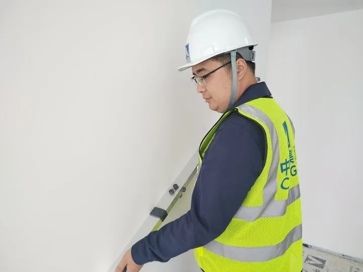 他的工作與瓷磚、膩?zhàn)印⑺啻蚪坏?,需要時(shí)刻手拿靠尺、角尺等檢測工具對項(xiàng)目乳膠漆墻面進(jìn)行實(shí)測實(shí)量;手拿空鼓錘對現(xiàn)場墻磚進(jìn)行空鼓排查,對每個(gè)部位全面排查、查找隱患,保證施工質(zhì)量。這樣的檢測動(dòng)作,每天要重復(fù)上千次,就是為了優(yōu)質(zhì)履約,為業(yè)主提供一個(gè)安全住所。