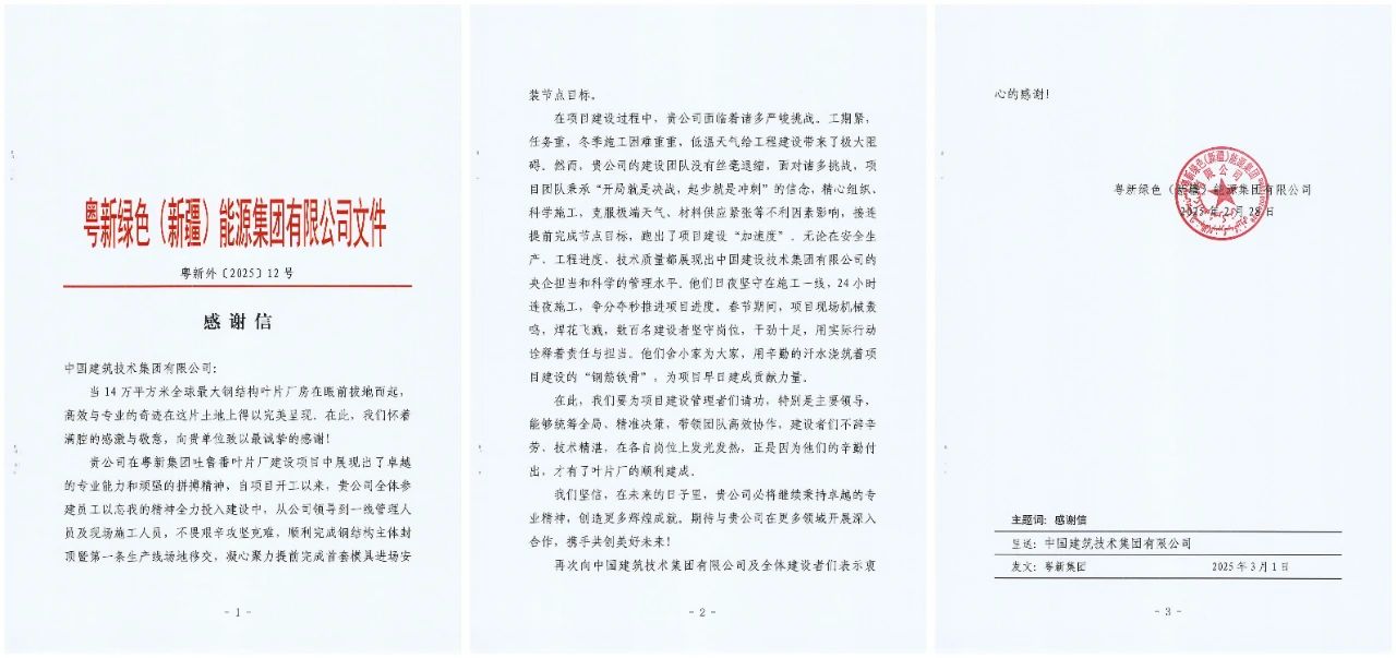 近日,中國建技收到明陽智慧能源粵新綠色(新疆)能源集團有限公司發(fā)來的感謝信。對中國建技在14萬平米的全球最大鋼結(jié)構(gòu)葉片廠房——吐魯番葉片廠房項目建設(shè)過程中的優(yōu)異表現(xiàn),給予了充分肯定和真摯感謝。