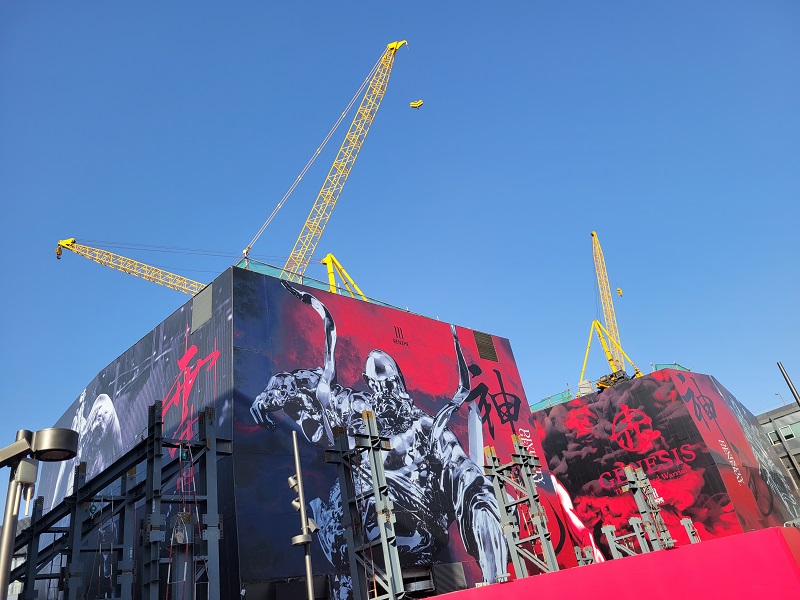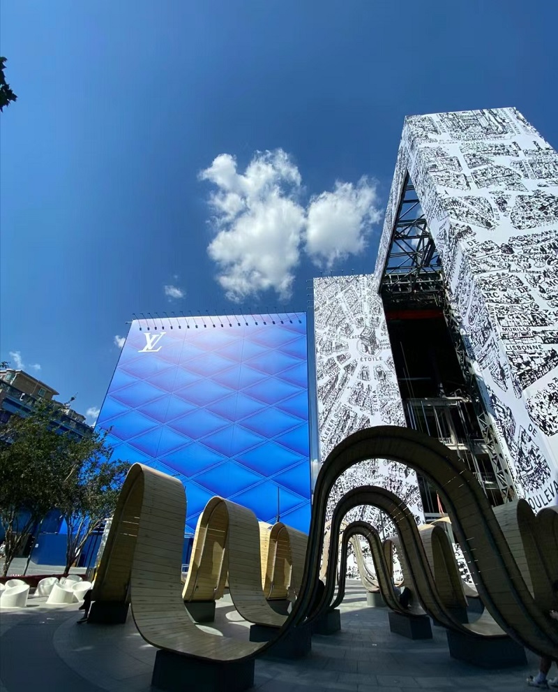 本項目施工內(nèi)容包括2棟樓的拆除、重建、加固、機(jī)電工程、幕墻、電梯安裝與裝飾裝修。項目位于三里屯繁華鬧市區(qū),東臨使館區(qū)、南連南區(qū)商業(yè)區(qū)、西和北側(cè)為住宅區(qū),周邊商業(yè)需正常運營,致使白天物料與大型車輛運輸受限,運輸需在夜間進(jìn)行,因此項目實施只能在非營業(yè)時間開展,且吊裝作業(yè)僅能于每日上午進(jìn)行。此項目對現(xiàn)場安全文明施工要求頗高,同時涉及市政管線、綠化移植、夜間施工、施工占道等大量需與政府部門溝通協(xié)調(diào)之事,且現(xiàn)場無臨時設(shè)施用地。